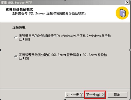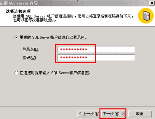 按下圖所示,按您的訂單中顯示的SQL用戶名和密碼,分別填寫后,點下一步;