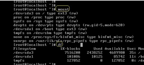 使用mount命令查看分區掛載情況,查看根分區、boot分區的掛載點的名稱,使用df命令查看掛載設備的大小。