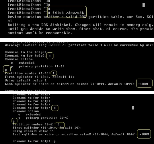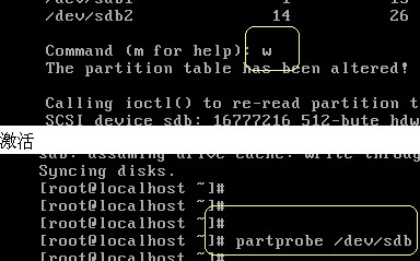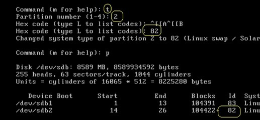 對新加硬盤/dev/sdb劃分分區,/dev/sdb1,和/dev/sdb2 大小為100M 指定 /dev/sdb2 的id為82,(即swap分區的文件系統類型),保存分區表,并激活分區