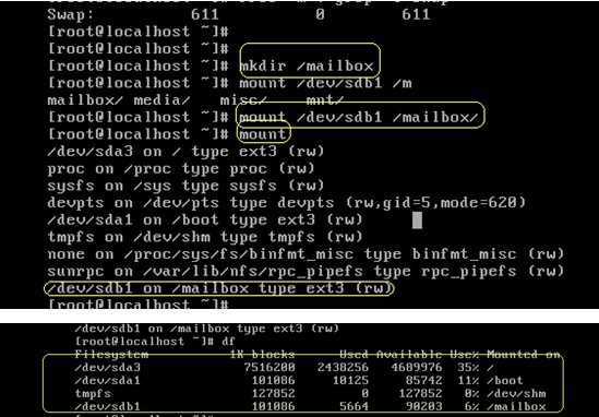 創建 /mailbox 目錄,(!注意是根下的mailbox)掛載 /dev/sdb1 到 /mailbox 使用mount命令查看分區掛載情況,使用df命令查看掛載設備的大小