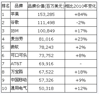 中國品牌繼續2010年的勢頭,有著不俗的表現,此次BrandZ全球最有價值品牌百強榜的12家中國公司分別是:中國移動(微博)(第九位)、工商銀行(第十一位)、中國建設銀行(第二十四位)、百度(第二十九位)、中國人壽(第三十三位)、中國銀行(第三十七位)、中國農業銀行(第四十三位)、騰訊(第五十二位)、中國石油(第七十八位)、平安保險(第八十三位)、中國電信(微博)(第九十一位)和招商銀行(第九十七位)。