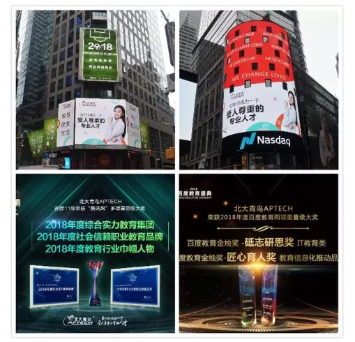 對于企業(yè)而言,榮譽(yù)是品牌實(shí)力最好的見證。細(xì)數(shù)北大青鳥APTECH的成長之路,收獲榮譽(yù)無數(shù),這些獎項(xiàng)榮譽(yù)就像一面鏡子,勾勒出的北大青鳥APTECH整體輪廓、發(fā)展軌跡和成長風(fēng)采。2018年初,北大青鳥登上了納斯達(dá)克和路透社大屏,在世界的十字路口發(fā)出響亮的中國聲音;年末,在騰訊“回響中國”教育年度盛典上,連續(xù)11年斬獲行業(yè)大獎;在“智IN中國——2018年百度教育盛典”上榮膺“砥志研思-IT教育類”和“匠心育人”。縱觀北大青鳥APTECH發(fā)展史,就是一部創(chuàng)造榮譽(yù)的奮斗史。