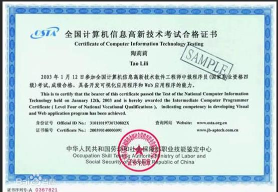 國家勞動和社會保障部職業技能鑒定中心認證的“軟件工程師”OSTA證書°