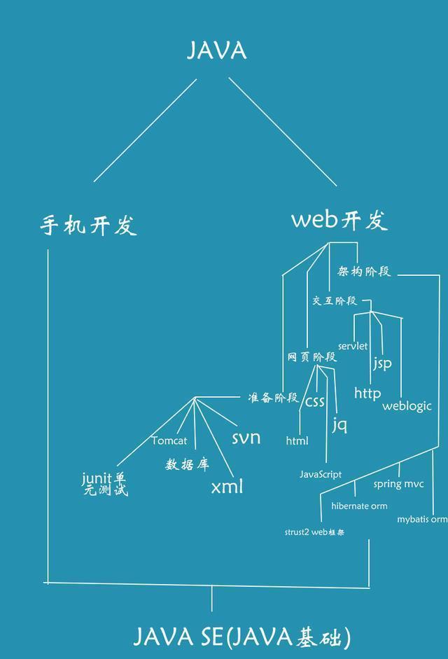 由上面分析圖可以知道,(在web方向上分析-----------------)簡單來說java 分四大階段(基礎階段,網頁階段,框架階段,交互階段)其中涉及的技術包括(java se基礎,mysql,jdbc,xml可擴展標記語言,svn,css,ajax,html,jq,ssh框架,servlet,weblogic,http超文本傳輸協議等等23種技術。)