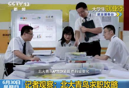 2013年6月,中央電視臺(tái)新聞?lì)l道《朝聞天下》與財(cái)經(jīng)頻道《第一時(shí)間》欄目,在大學(xué)生就業(yè)季,對(duì)北大青鳥APTECH通過注重實(shí)戰(zhàn)能力培養(yǎng),幫助大學(xué)生成功高薪就業(yè)進(jìn)行了深度報(bào)道。