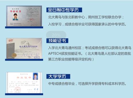北大青鳥通州校區與張北職教中心,朔州技工學校合作辦學,入學成績合格可獲得發國家頒發的全日制正規學歷證書,并可以深造大專學歷。