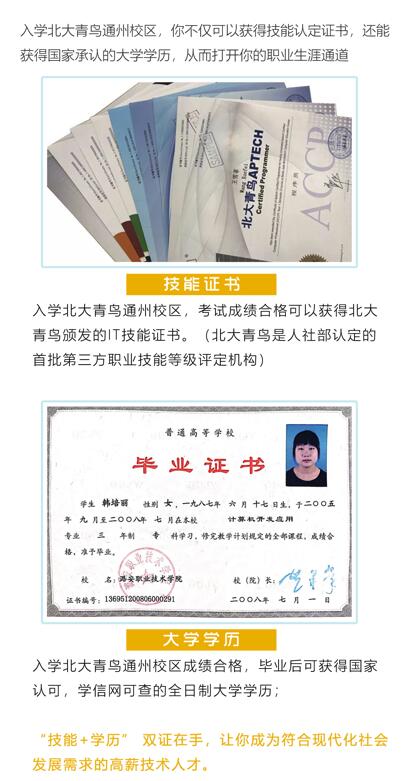 北大青鳥學校是專業從事計算機職業教育培訓的,從性質上來說屬于職業教育學校,所以學員畢業之后獲得的是專業認證的技術證書,并非學歷證書,而所頒發的技能證書還是非常有含金量的。但是參加北大青鳥課程學習,卻可以得到學歷證書,這是怎么回事兒呢?